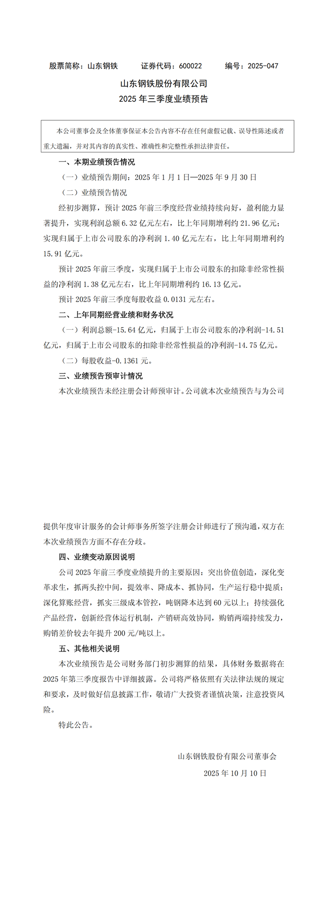 山东钢铁:山东钢铁股份有限公司2025年三季度业绩预告