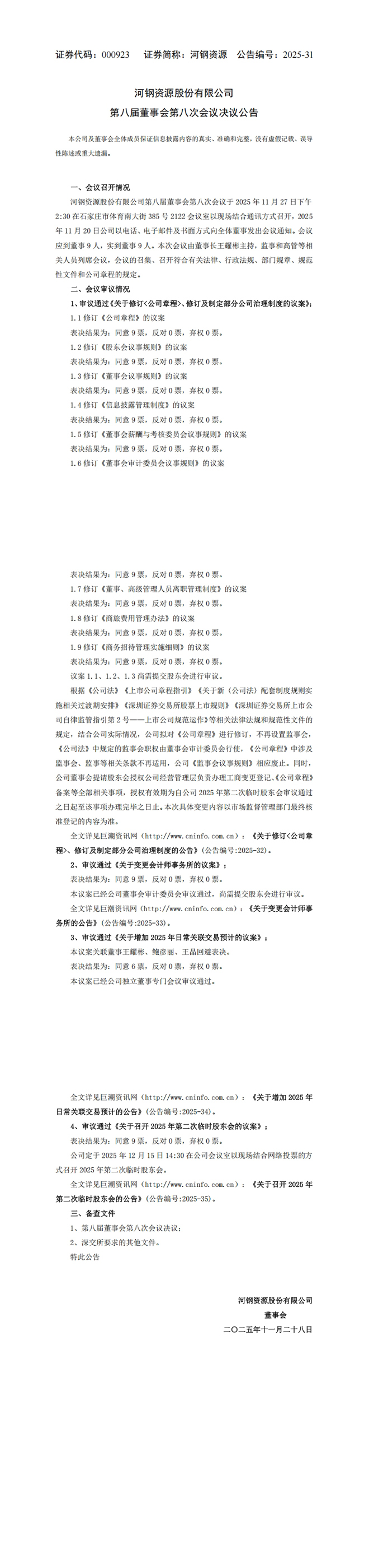 河钢资源:第八届董事会第八次会议决议公告