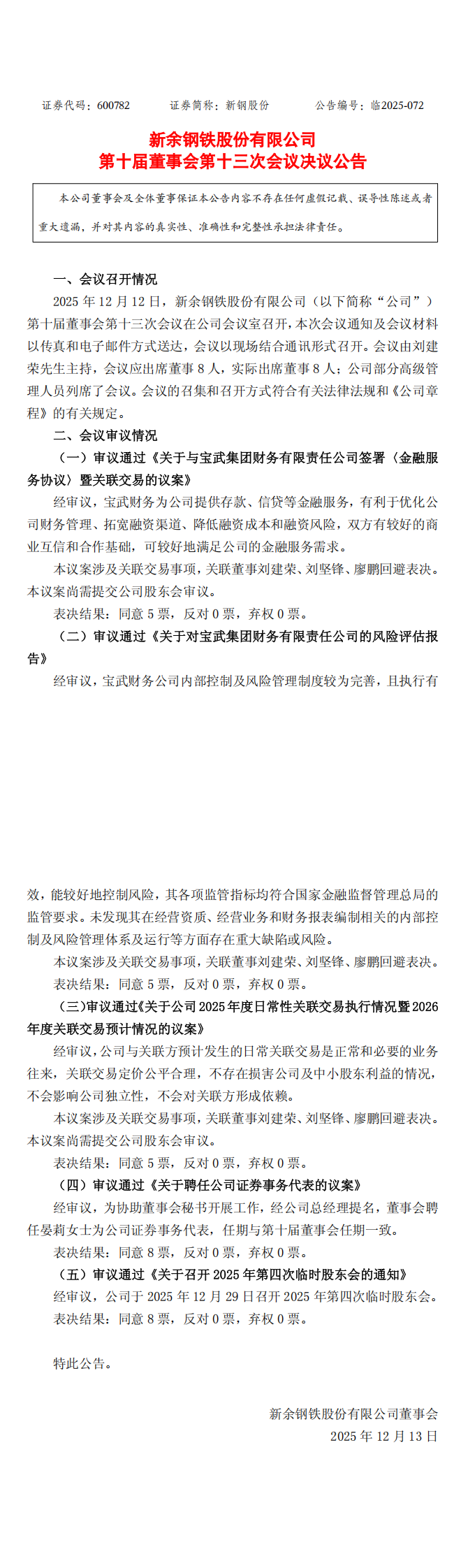 新钢股份:新钢股份第十届董事会第十三次会议决议公告