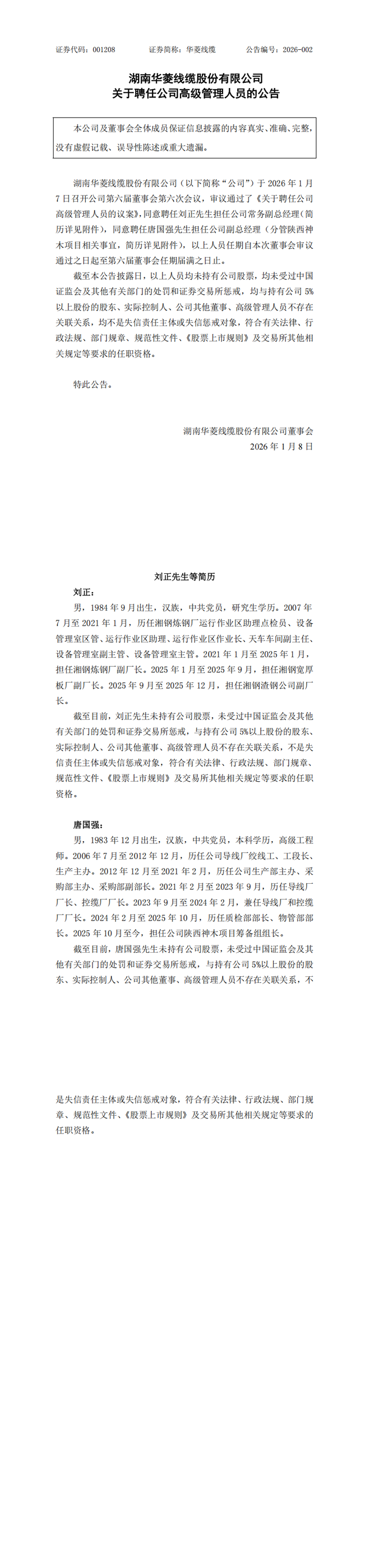 华菱线缆:湖南华菱线缆股份有限公司关于聘任公司高级管理人员的公告
