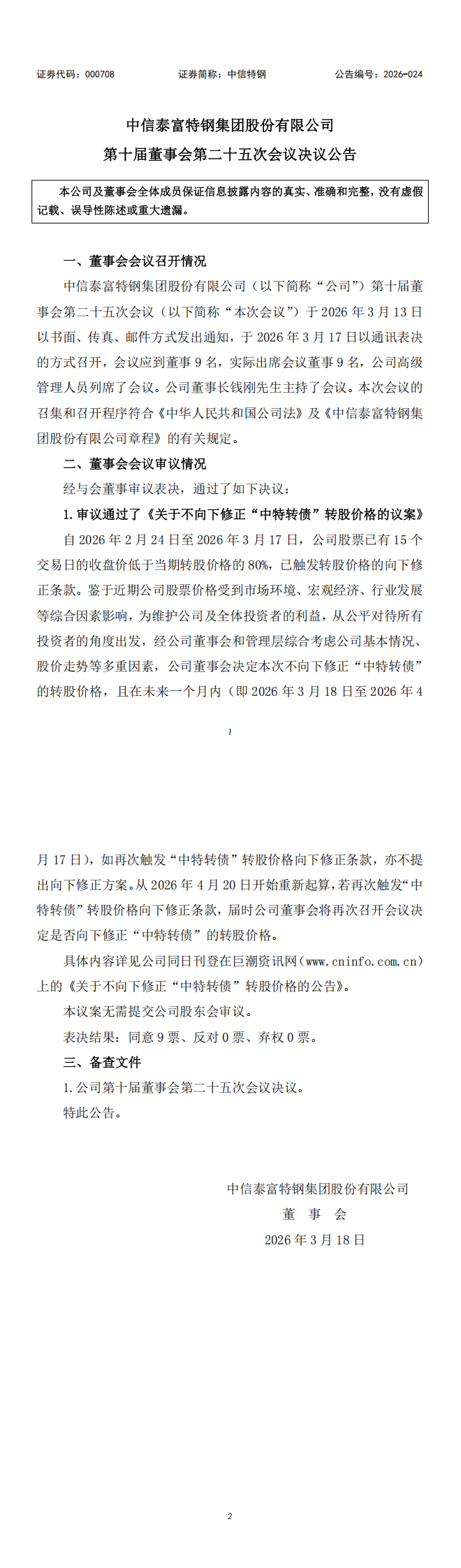 中信特钢:第十届董事会第二十五次会议决议公告