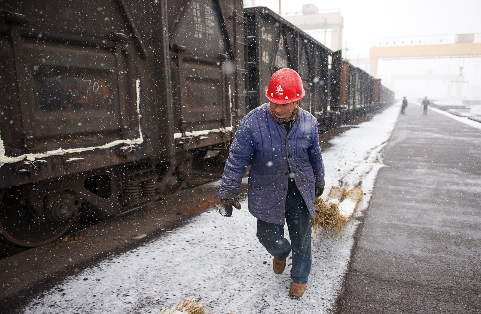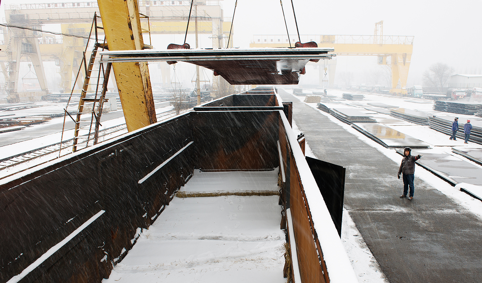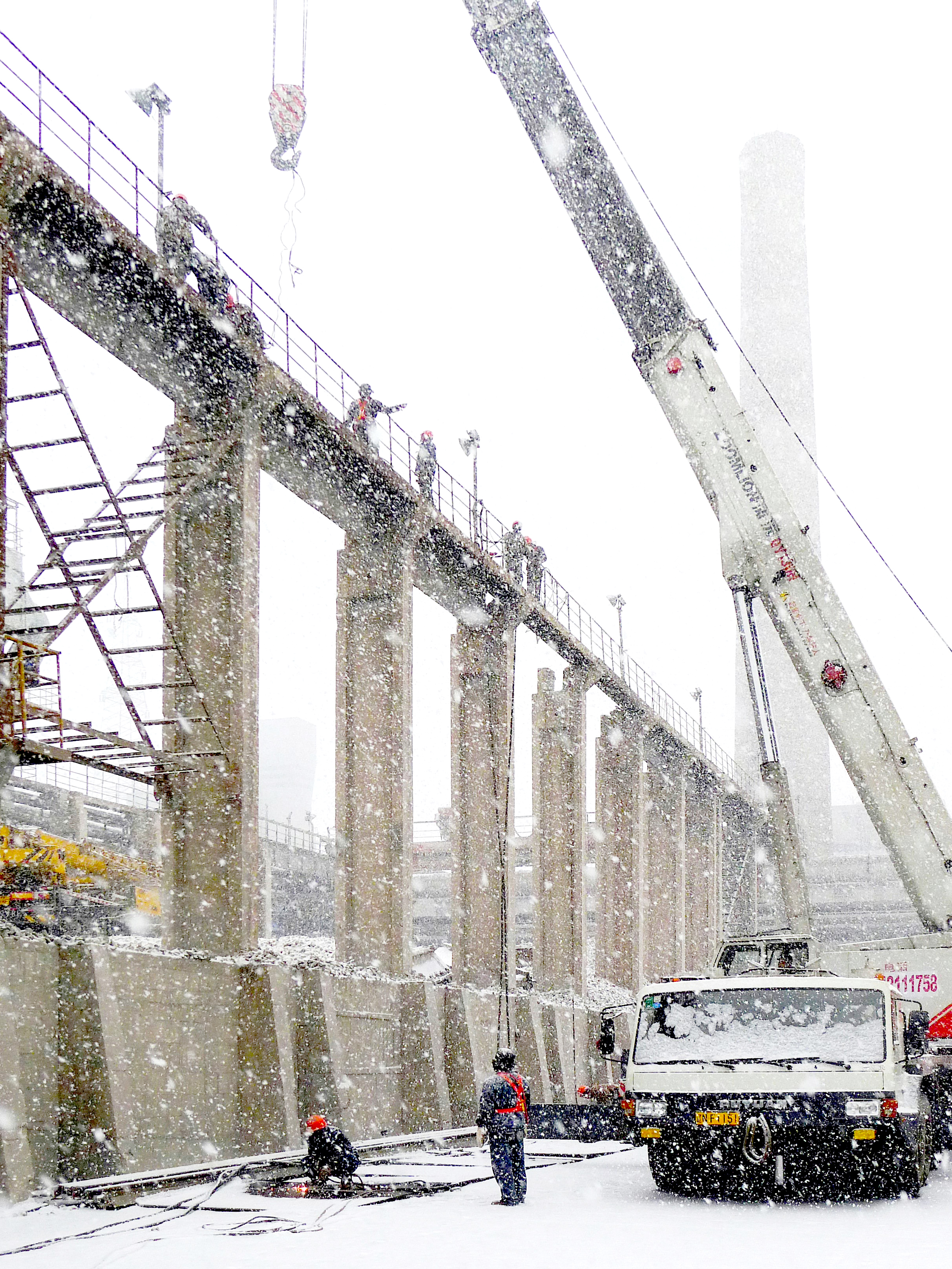 安钢销售总公司职工在风雪中吊装发往西安的火车。(特约通讯员 殷海民 摄)