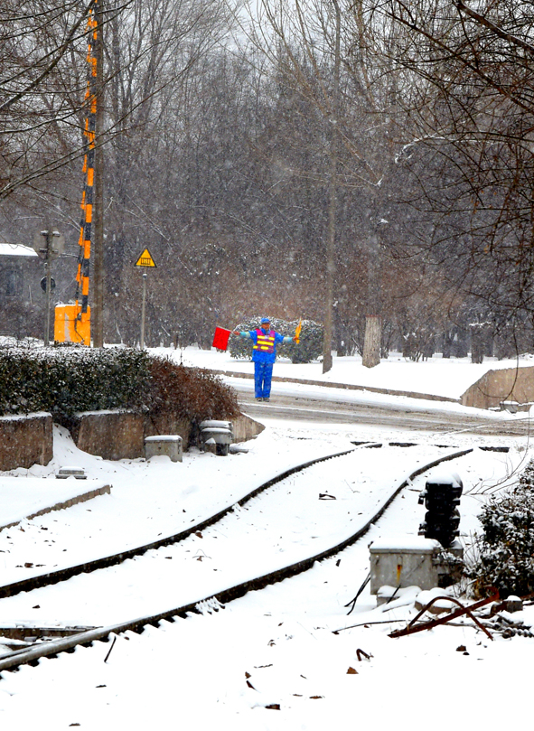 太钢道口工在铁道叉口冒雪工作。(特约通讯员 王旭宏 摄)