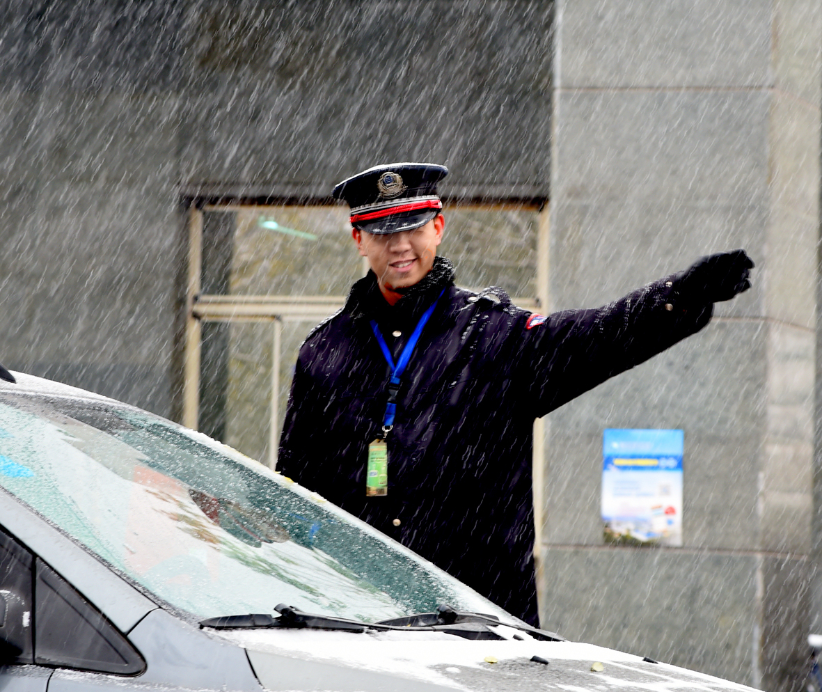 冒雪执勤的太钢护卫人员依然保持着微笑。(特约通讯员 王旭宏 摄)
