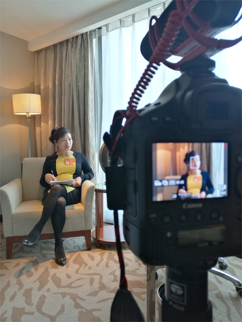 全国人大代表徐筱芗(右)在河南代表团驻地接受《中国冶金报》记者的专访时,向记者介绍议案内容。