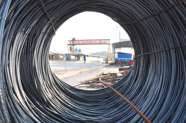 图为现场正在使用的热轧带肋钢筋。