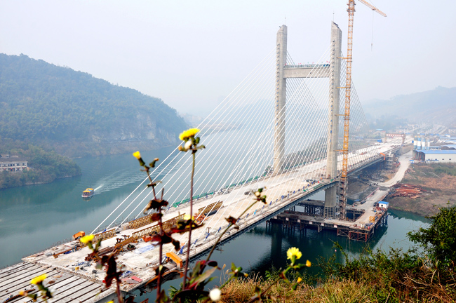 3月13日,湖南省湘中地区首座斜拉桥、“世界锑都”冷水江市地标性建筑、湖南省交通重点建设工程,总投资2.5亿元的新城大桥全线拉通合龙(如图)。湖南博长控股集团冷水江钢铁有限责任公司生产的热轧带肋钢筋独家供货新城大桥。该桥全长426米,主桥为2×149米门型独塔斜拉桥,桥宽34米、塔高101米、双向六车道,据悉,该桥将于2017年7月1日前通车。(特约通讯员 熊又华 摄影报道)