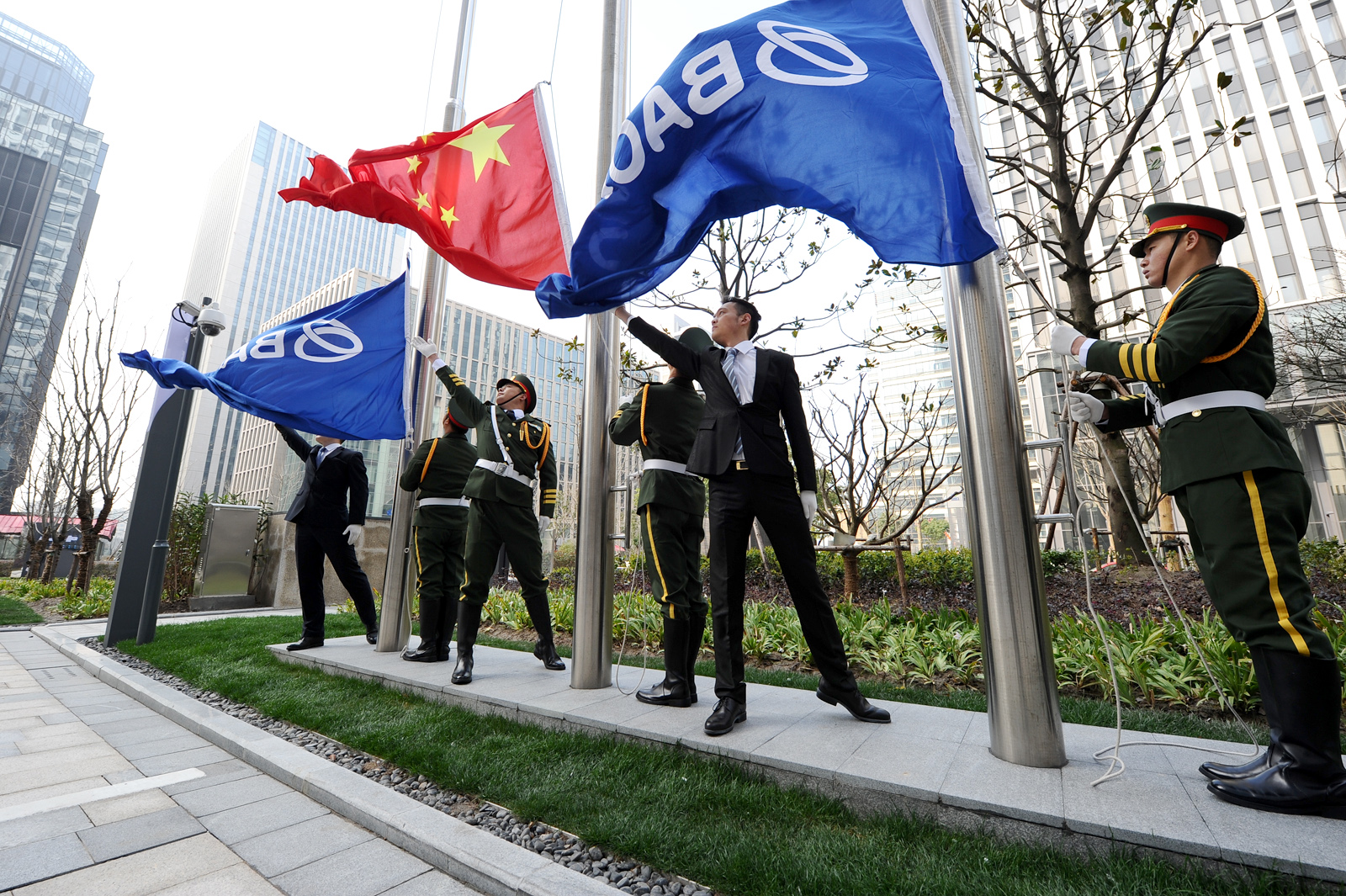 宝武集团党委书记、董事长马国强将印有宝武集团LOGO,寓意持续发展、生生不息的两面司旗授予两位宝武集团青年代表。宝武集团总经理、党委副书记陈德荣致辞。在集团公司总部办公的集团公司助理以上领导,总部各部门员工代表共计80余人出席了升旗仪式。