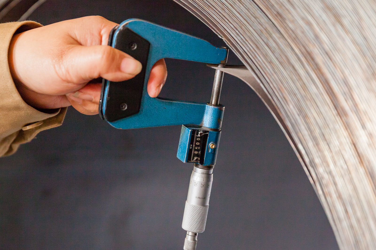 日前,宝武集团武钢股份条材总厂以优异的板形质量完成了对0.8毫米热轧带钢的平整任务,至此该产线已打通了全球最薄热轧带钢生产工序中的所有技术瓶颈,具备大批量供应市场的生产能力。图为员工正在测量钢卷厚度尺寸。(艾勇 摄)