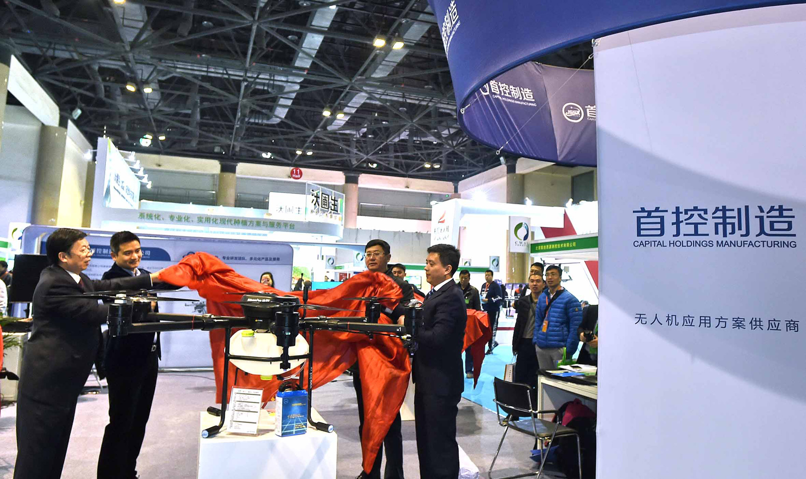 3月29日,首钢控股公司江苏制造技术公司自主研发设计的“山野”SS-1植保无人机,在第五届中国(北京)国际智慧农业装备与技术博览会亮相。该产品于2017年3月正式投放市场,其最大亮点在于15公斤级载荷,大幅领先于国内普遍10公斤级载荷水平。图为该产品在博览会亮相瞬间。(特约通讯员 袁德祥 王京广 摄)