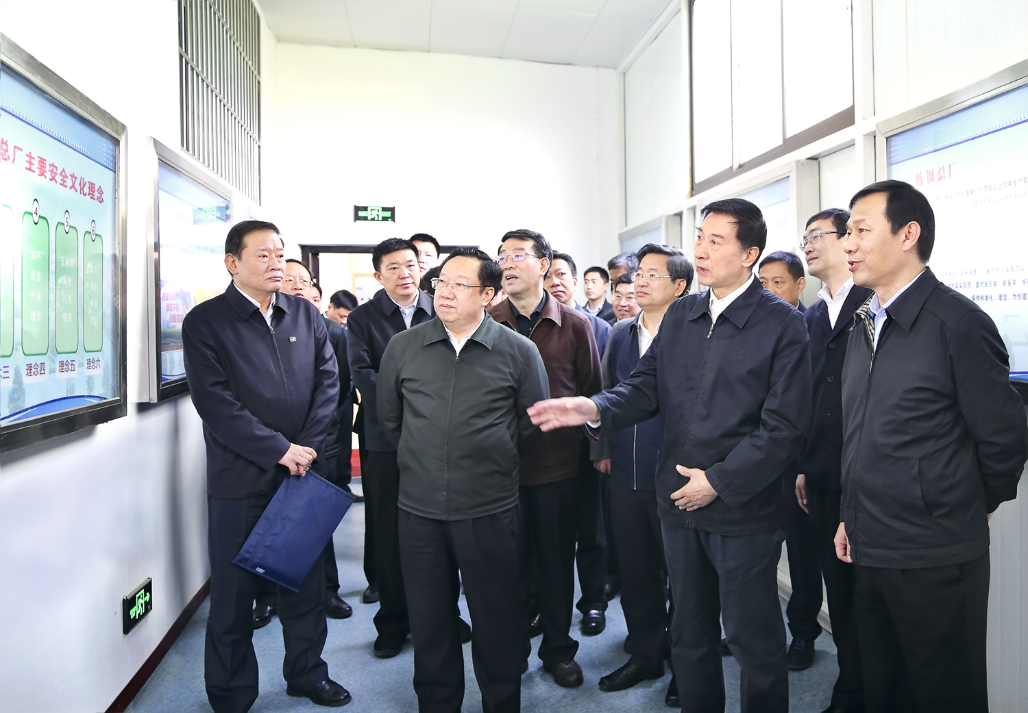 4月13日,国务委员王勇(前排右二)在湖北省委副书记、省长王晓东(前排左二)等领导陪同下,来到宝武集团武钢有限公司调研考察安全生产工作。宝武集团党委书记、董事长马国强(前排右一)等陪同考察。图为王勇在武钢有限公司炼钢厂四炼钢文化展示长廊边走边看,对炼钢厂全员参与的安全文化理念表示肯定。(记者 朱旺春 通讯员 王友农 张运学 摄)