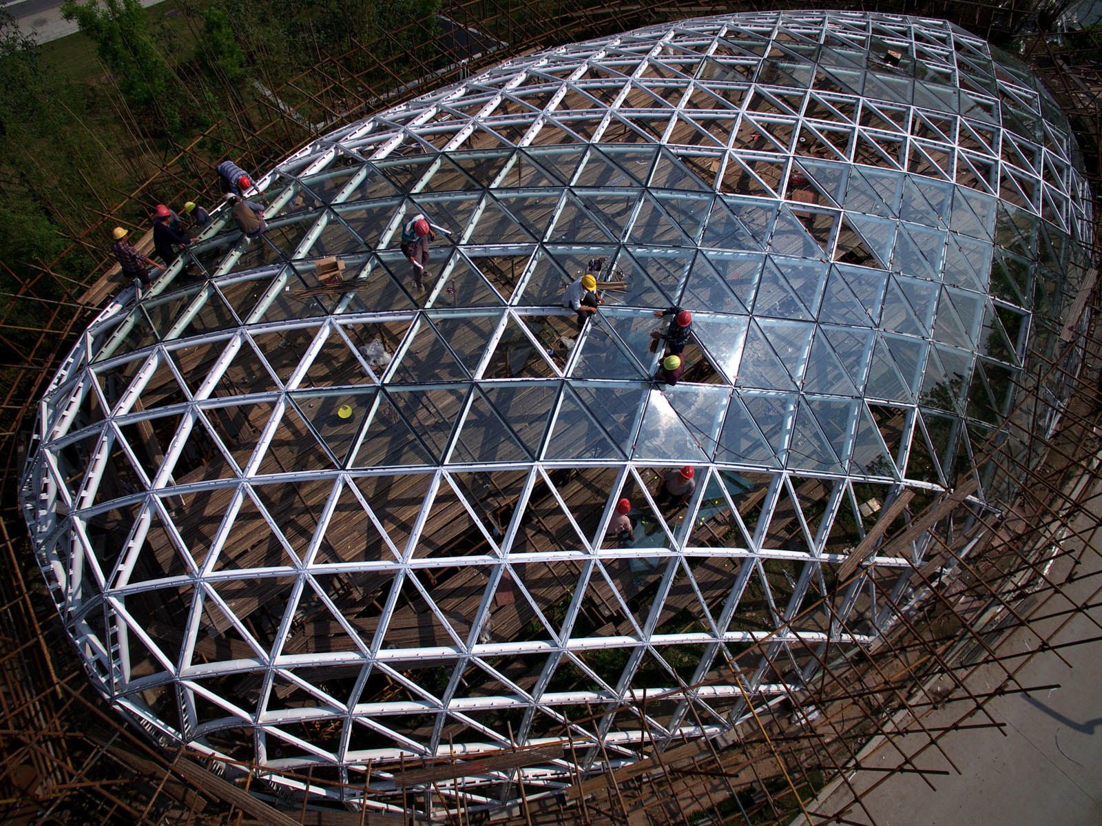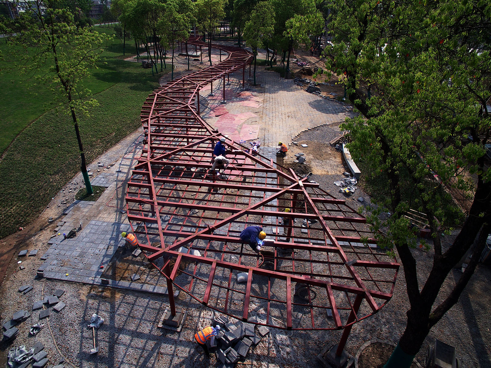 蛇形廊架顶铺板安装。