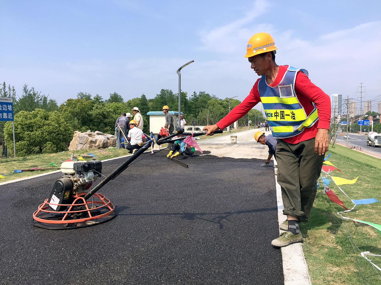 工人正在进行堤顶绿道胶筑石底层施工。