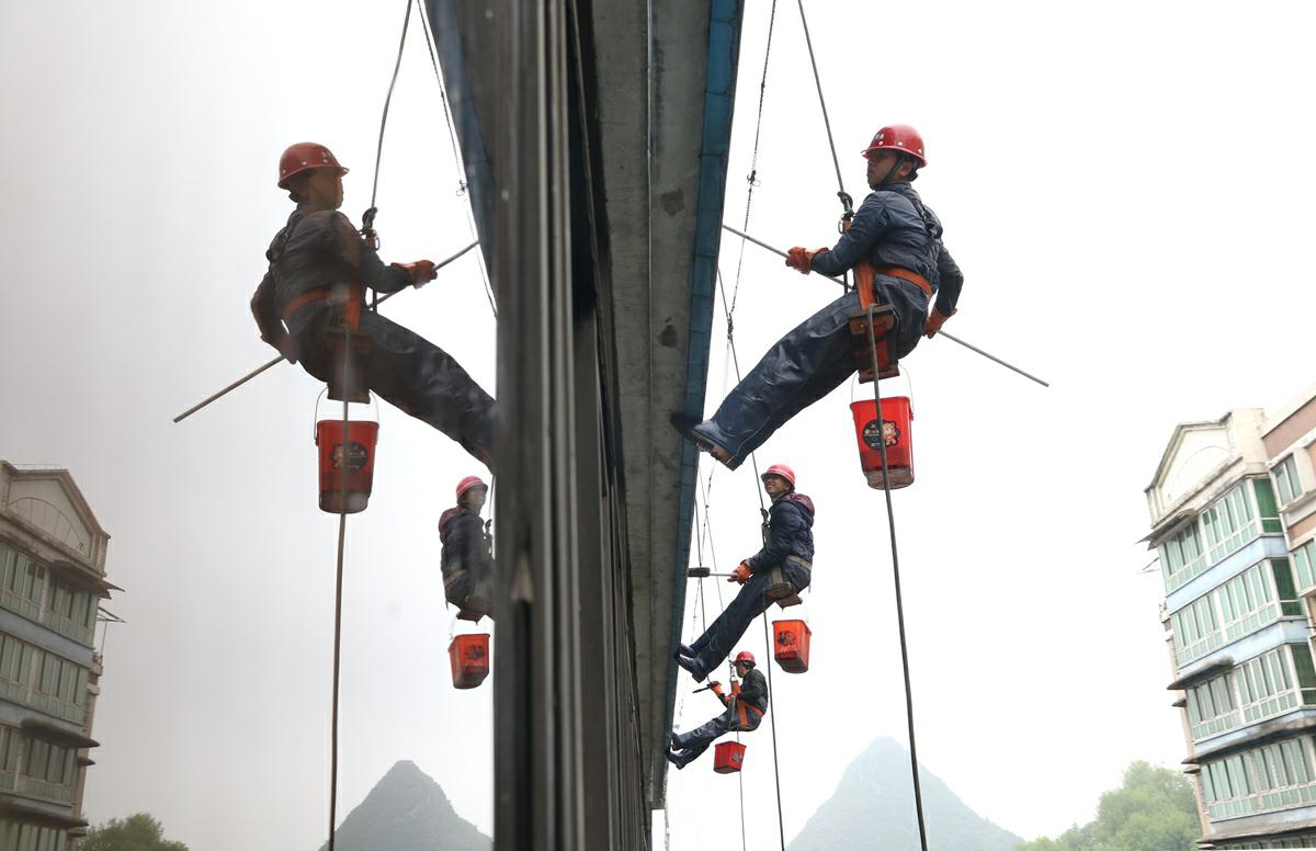 自首钢水钢打造“花园式工厂”以来,水钢博宏公司d大力开展现场文明生产、环境绿化美化等工作,进一步改善了厂区环境和企业形象。图为5月6日,该公司组织人员对办公楼的外墙和玻璃进行清洗,打造清洁的办公环境。(熊锋 摄)