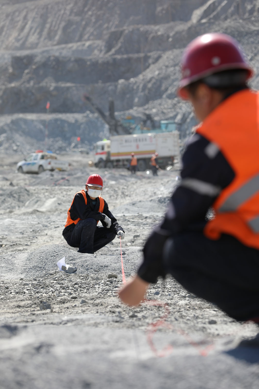 图为技术人员在作爆破前准备工作。