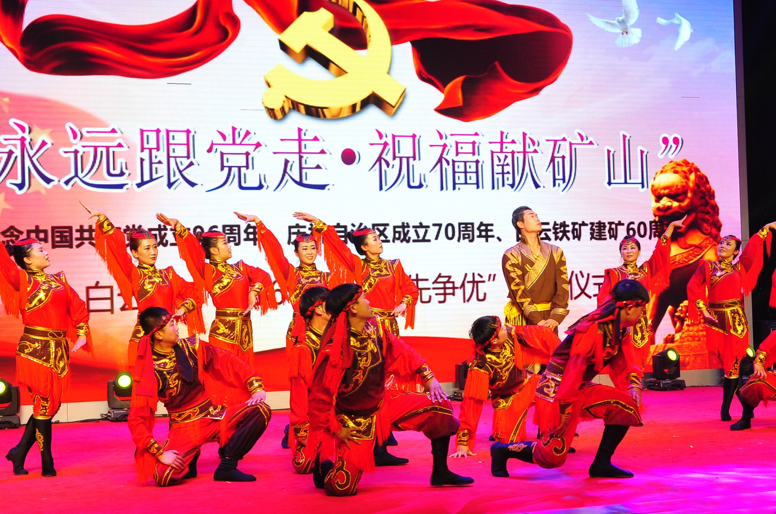 在党的96岁生日到来前夕,庆祝自治区成立70周年、白云铁矿建矿60周年文艺演出在包钢白云鄂博铁矿文体中心举行。铁矿职工们用自编自导的舞蹈、诗朗诵、大合唱等节目,热情讴歌了中国共产党的丰功伟绩和自治区成立70周年、白云铁矿建矿60年来所取得的成绩。(记者 白立新 摄)
