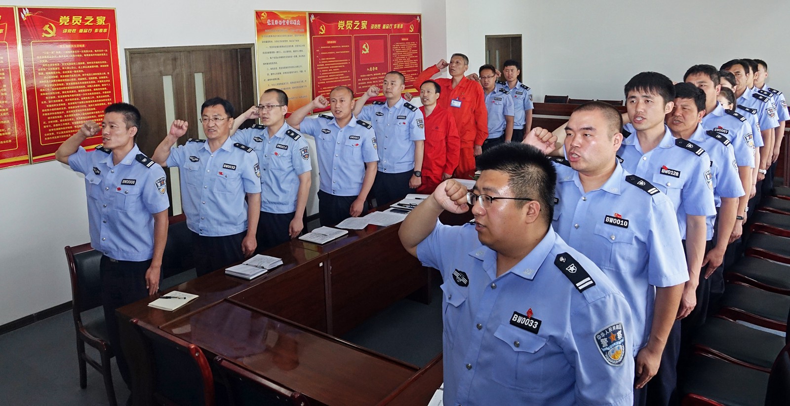 七一前夕,东北特钢集团武装保卫部党总支召开学习贯彻习近平总书记关于“三个推进”重要讲话精神暨“两学一做”学习教育常态化制度化第一专题学习研讨会。会上,全体党员重温入党誓词,决心充分发挥党员先锋模范带头作用,恪尽职守做好本职工作。(特约通讯员 刘德斌 摄)