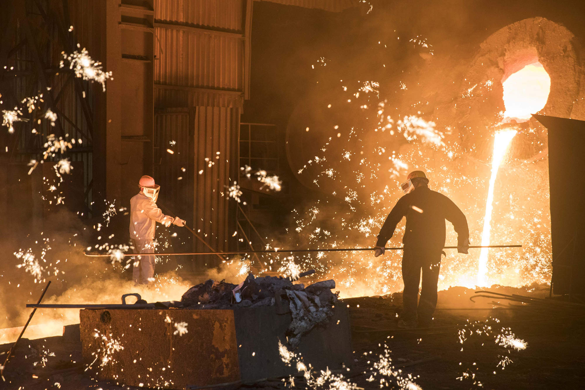 工人们在铸铁机旁浇铸的场景。