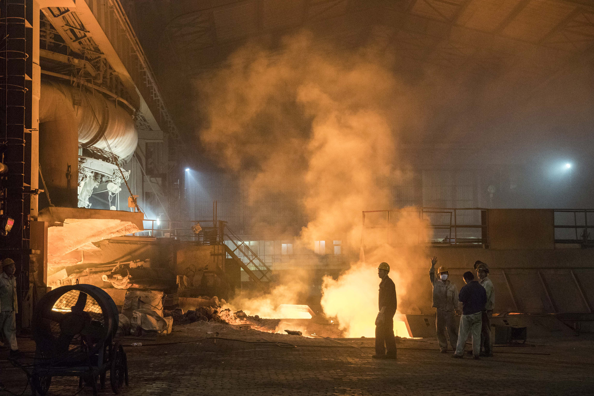 济钢3号1750立方米高炉即将流完最后一炉铁,炉前工看到记者离去挥手告别。