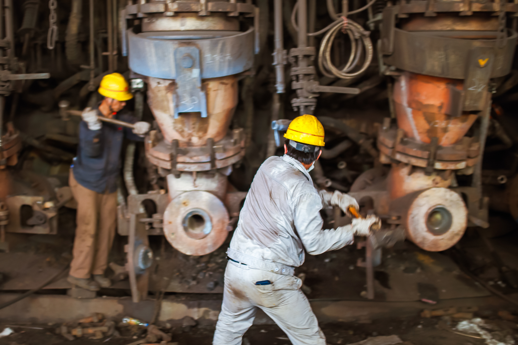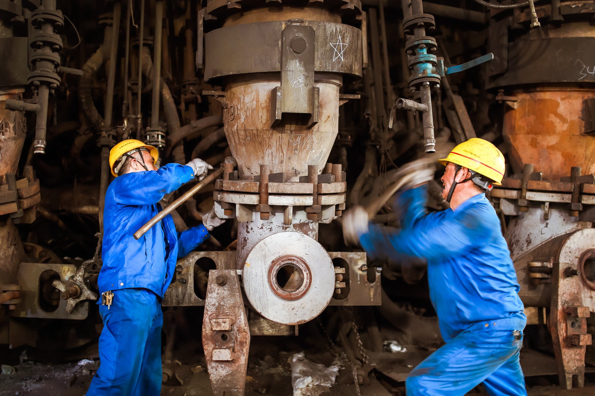 图为7月14日上午8时,职工们齐聚A座高炉风口平台,在叉车的配合下,挥舞大锤,将风口安装到位