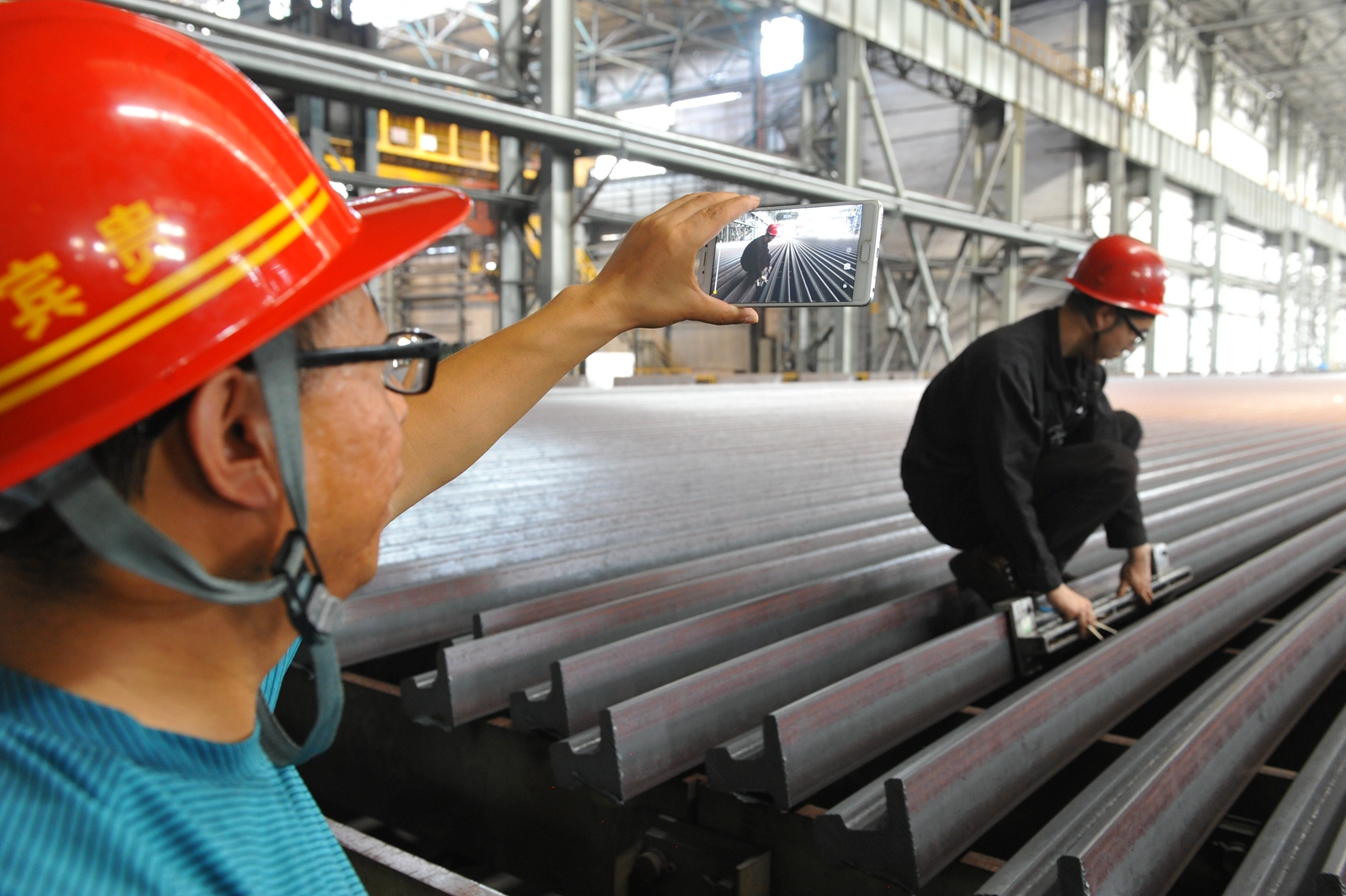 日前,内蒙古广播电视台联手央视新闻制作了庆祝内蒙古自治区成立70周年系列报道——我用这样的方式爱你,报道聚焦了包钢。媒体记者走进包钢轨梁厂,现场直播包钢百米高速钢轨的诞生过程。节目集中反映了包钢职工风采、以及包钢为祖国铁路事业发展所做出的贡献。图为媒体记者正在现场用手机录制工人检查钢轨表面质量的画面。(记者 白立新 摄)