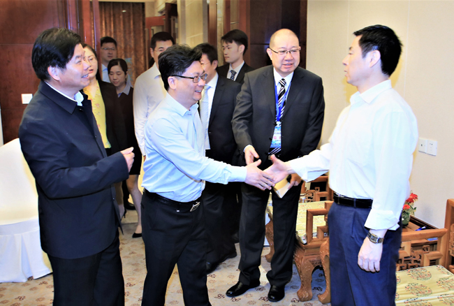 宜兴市委副书记、市长张立军(前排左二),中国工程院院士毛新平(右一),中国钢铁工业协会副秘书长、中国冶金报社社长兼总编辑陆闻言(右二),共昌集团董事长邵顺才(左一)在会前进行交流。