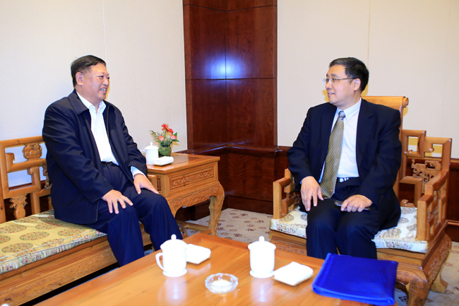 中国钢铁工业协会副秘书长王德春(右)与大峘集团董事长卢显忠进行交流。