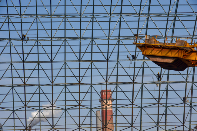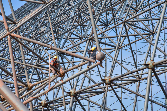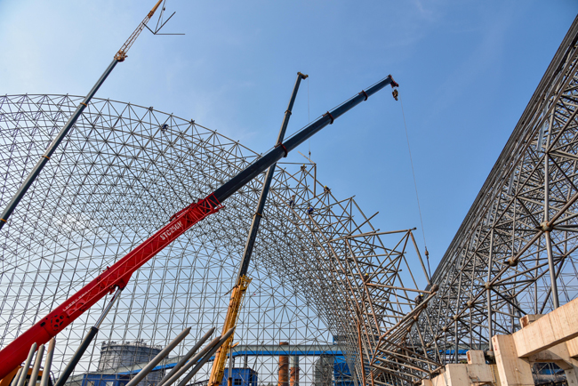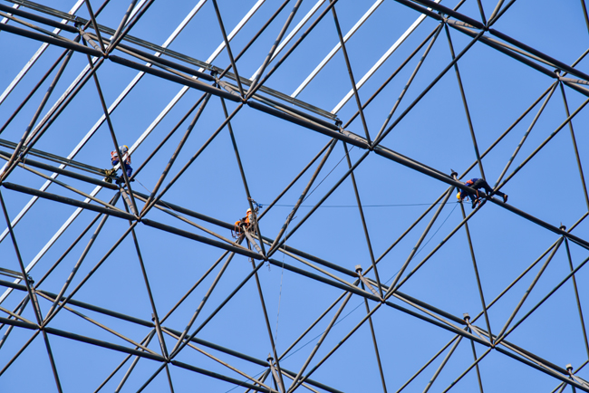 萍安钢铁公司原料场棚化改造项目总投资1.7亿元。包括三个主体部分,A跨焦炭货场,高48米,跨度125米;B跨矿粉料场高53米,跨度145米;C跨混匀平铺料场,高37米,跨度89米。C跨已于4月30日建成投入使用,比计划提前1个月,其中又以B跨矿粉料场技术难度最大,145米的跨度,是目前最大跨度的大棚,国内投入使用的仅有两家,萍安钢铁是第三家。为了提高工作效率,“蜘蛛人”一般3-5人一组团队合作,在这项钢结构为主的工程中,中南钢构总共派出了172人,其中41人负责地面协助工作,有131位名符其实的“蜘蛛人”。