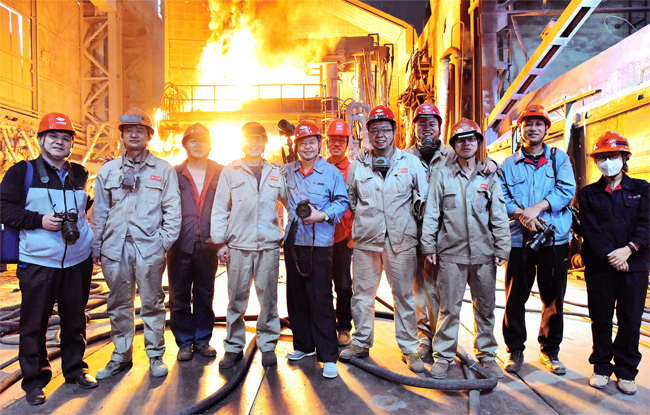 10月1日,山钢股份莱芜分公司特钢事业部工会组织十余名职工摄影家下车间、进现场、到岗位。把镜头对准了奋战在生产一线的劳动者,拍摄下一幅幅他们忘我拼搏、无私奉献的精彩瞬间。和劳动者们一起在火热的作业岗位上,庆祝祖国的生日。图为摄影家和炼钢工在电炉前合影并祝福祖国。 (特约通讯员 王启东 摄)