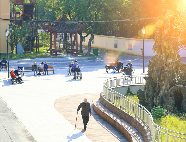 图为该公司南山护理院的老人们-大早在开阔的广场享受阳光。
