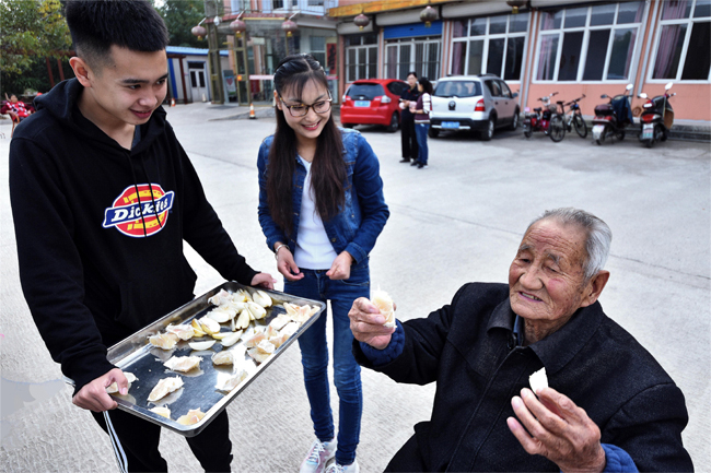 10月14日,山钢股份莱芜分公司特钢事业部工会和团委开展“重阳敬老”活动。组织15名青年志愿者,带着水果、点心等来到莱芜汶河颐养院。帮助老人们清理卫生、健康养老知识讲解、电器电线隐患整改以及为老人们包制了1200余个水饺等。表达了企业对老年人的浓浓关爱之情。图为志愿者正在请老人品尝各种低糖水果。