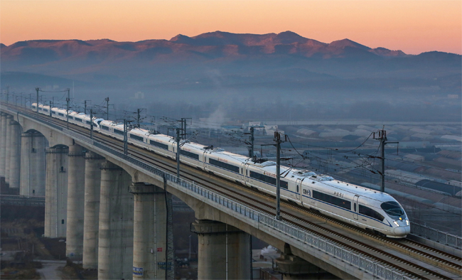 2018年12月29日,京沈高铁辽宁段建成通车运营。当日7时31分,由牛河梁站首发至沈阳站的G9151次高铁列车正在通过凌源市大凌河西支特大桥(如图)。据悉,京沈高铁自2014年开工建设以来,凌钢向京沈高铁供应螺纹钢等优质钢材达100余万吨,助力京沈高铁提前建成通车。(特约通讯员 曹凤友 摄)