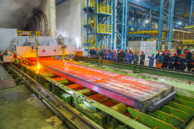1月9日17时18分,随着满载钢水的钢包平稳回转就位,山钢日照公司炼钢4号连铸机正式开始浇铸,40分钟后,火红的钢坯被整齐切割,全线设备运转正常,热负荷试车取得圆满成功。4号连铸机生产的钢坯主要供4300毫米宽厚板轧机,也可供应3500毫米炉卷轧机和2050毫米热轧轧机,最终产品包括管线板、造船板和压力容器板等7个大类,年可生产钢坯150万吨。图为热负荷试车现场。(郭阳 摄)