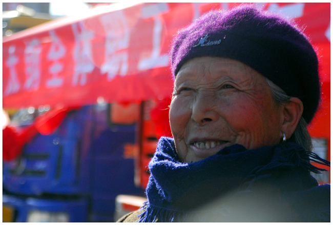 图片拍摄于2009年11月23日,当天太钢向山西贫困县娄烦县捐赠1万吨原煤,陈福姐老人看到进入乡村的运煤车后,感到冬天家里取暖用的煤有着落了,不禁开心地笑了。