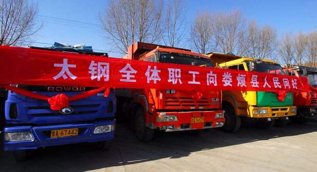 图为2009年11月23日,太钢向娄烦县捐赠原煤的运送车辆。