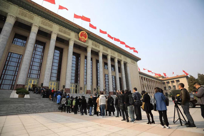 ▲新闻发布会开始1个多小时前,记者们早已在人民大会堂前排起长队。