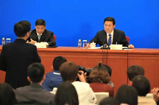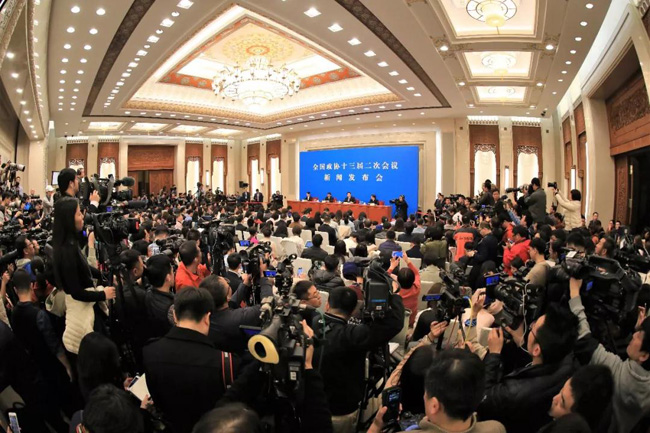 《中国冶金报》、中国钢铁新闻网两会报道组记者朱晓波(二排左二)在新闻发布会现场举手提问。