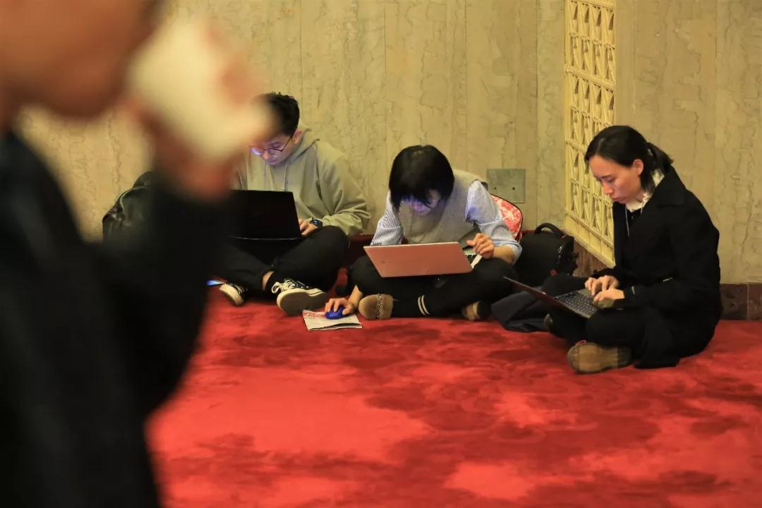▲发布会结束后,记者们就地办公,紧张工作。