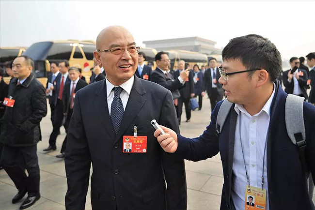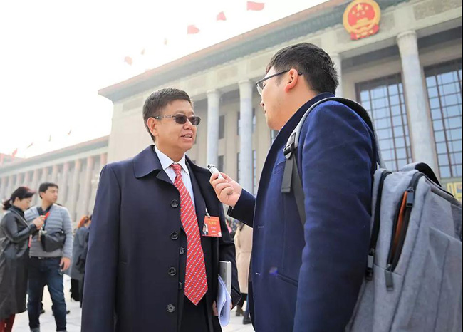 何文波委员在步入人民大会堂前接受《中国冶金报》、中国钢铁新闻网两会报道组记者现场采访。