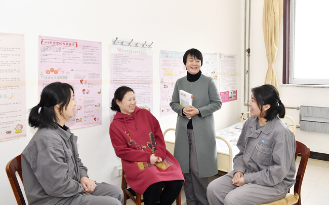 长期以来,河钢唐钢切实维护女职工特殊权益,陆续在该公司中厚板公司、教育中心等5家单位设立了“爱心妈妈小屋”,在小屋内配置了冰箱、微波炉、消毒柜、饮水机、吸奶器以及有关母乳喂养和育儿的书籍,为“四期”女工提供卫生舒适的休息场所,同时不定期组织心理咨询师进行现场答疑解惑,为广大女职工提供实实在在的服务。图为河钢唐钢职工、心理咨询师高翔(右二)正在与女职工针对育儿问题进行交流。(赵辉 高玉 摄)