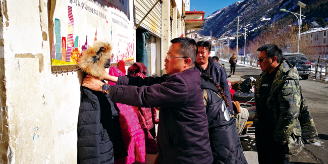 孙劲把内地朋友捐赠的冬衣挂在当堆乡政府旁的“爱心墙”上。
