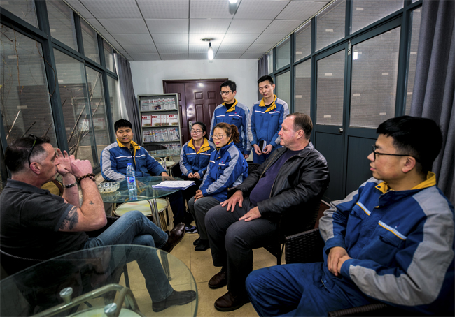 自2018年12月起,马钢特钢公司专业技术人员经常利用工余时间,聚集在该公司图书室内进行外语“微课堂”学习。该公司通过内外结合的培训形式,不断提升专业技术人员外语会话能力,助力加快特钢产品向高端化、国际化市场进军的步伐。图为3月28日,英国外教皮特和杰米正在和学员交流。 (特约通讯员 罗继胜 通讯员 邹轶 摄)
