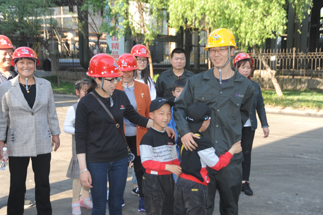 5月1日,泰山钢铁集团邀请部分职工家属走进企业参观,了解亲人们的工作情况,一起为坚持节日生产的劳动者点赞、祝福。图为泰山钢铁集团焦化厂脱硝班班长 王振波(前排右)与家人一起参观。 (特约通讯员 郑亮友 摄)