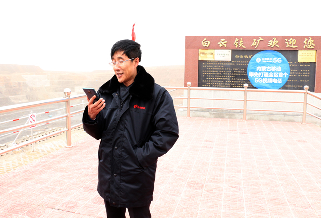 图为孙盛在白云铁矿主矿观礼台接受5G视频电话。