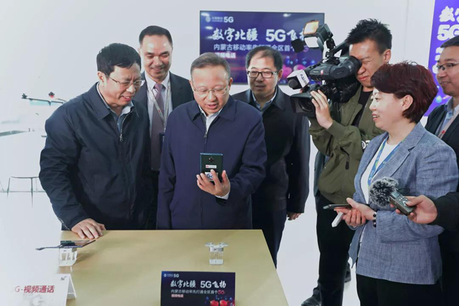 4月29日11时30分,内蒙古自治区副主席张韶春(左三)从呼和浩特市,通过5G技术与包钢白云铁矿矿长孙盛进行视频通话(如图)。这标志着内蒙古自治区首个5G视频电话正式开通。据了解,近年来包钢高度重视智能制造在生产经营中的应用,目前,无人机安全巡航、人脸识别安全检测等技术,已应用于生产和矿山巡查。(记者 白立新 通讯员 冉越超 摄 )