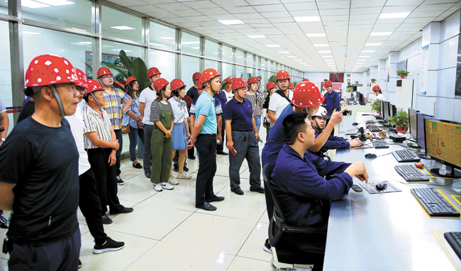 6月15日,华菱湘钢迎来了一批特殊的客人,他们是湘钢邀请的湘潭市环保志愿者和周边居民代表共计40多人,此行是专门来给湘钢的环保工作“挑刺揭短”的。这批客人先后参观了湘钢1号高炉区域隔声墙、焦化煤场、一烧脱硫、烧结料场、中水回用工程等环保工程,并对湘钢环保工作提出了建议和期望。图为参观者在湘钢生产线参观。(王班勇 胡石强 摄)