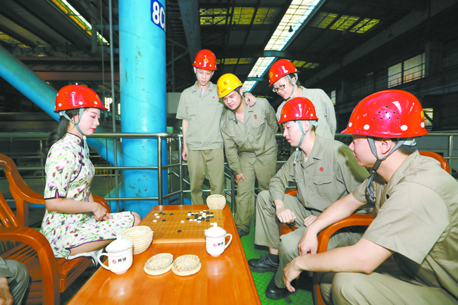 5月25日,城市围棋联赛2019赛季柳州揭幕战在柳钢文化中心开幕。据悉,2019赛季参赛俱乐部来自8个国家的32座城市,参赛人数超过370人。图为在围棋普及进柳钢活动中,部分棋手趁生产间隙与一线职工进行互动。 (记者 覃守超 实习记者 罗熔军 通讯员 梁攀 摄)