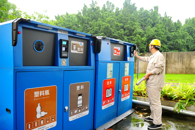 7月18日,中国宝武广东韶钢公司职工正在把生活垃圾投放到对应的垃圾箱内(如图)。据悉,今年3月开始,该公司在厂区设置5处生活垃圾智能回收装置。各单位对产生的可回收生活垃圾(如废纸、废塑料等),用手机扫描智能回收装置上的二维码,按要求投放至对应窗口,智能回收装置会自动识别、计算出所投废弃物品积分,积分达到一定数值后,可到委托管理单位进行换购物日用品。(陈立新 摄)