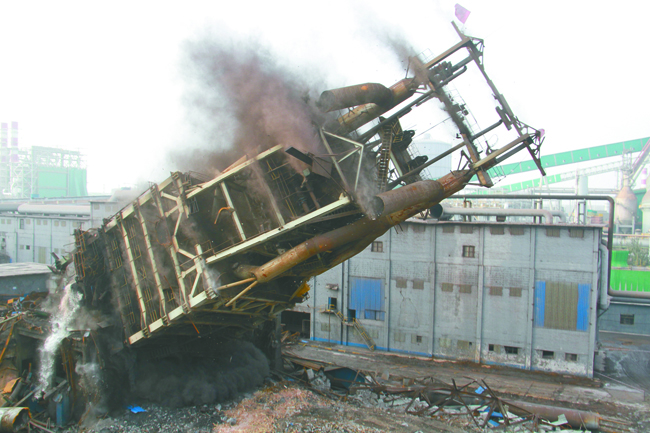 10月7日,晋南集团立恒钢铁按照“装备升级、减量置换”的产业政策要求,对现有的450立方米高炉、550立方米高炉、65吨转炉等旧装备进行拆除,为即将投产的1860立方米高炉及配套项目创造了前提条件。图为450立方米高炉拆除倾倒瞬间。(实习记者 丁卫国 摄)