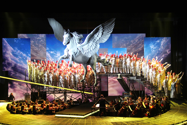 10月15日晚,由包头市委宣传部、包钢(集团)公司、包头市文化旅游广电局主办,包头市民族歌舞剧院、内蒙古铁花文化产业投资有限责任公司承办的大型原创民族歌剧《双翼神马》音乐会版在包头市大剧院上演。该剧以包钢轨梁厂的产品生产、技术攻关和创新为素材,塑造了老中青三代包钢人前赴后继、奉献一生的感人事迹,展现了包钢在变革中求发展,在创新中求突破的企业精神。图为演出现场。(记者 白立新 通讯员 赵伟佳 摄)